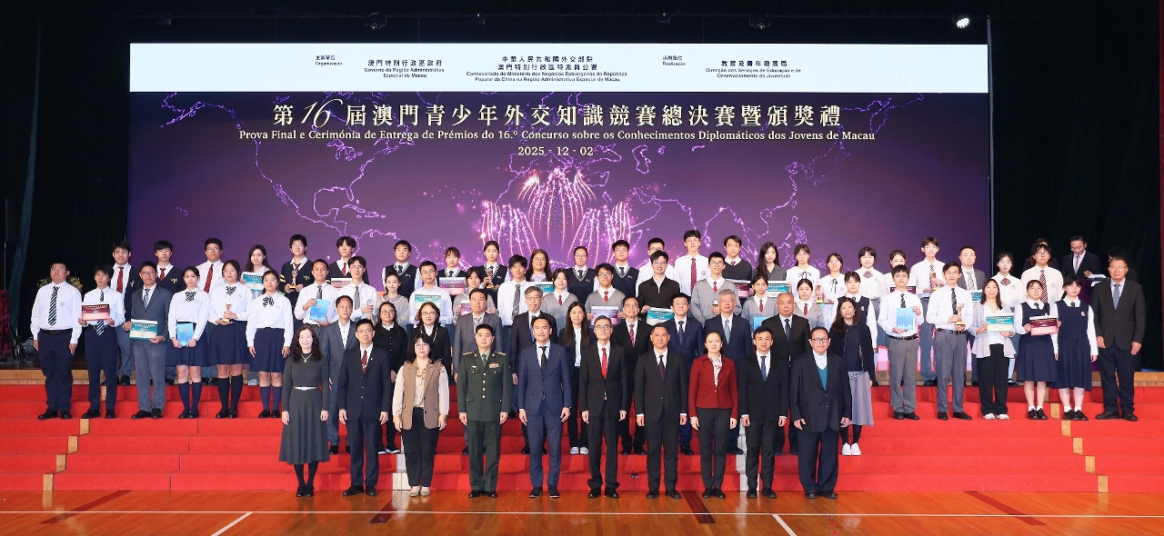 由澳門特別行政區政府與中華人民共和國外交部駐澳門特別行政區特派員公署主辦、教育及青年發展局承辦的第16屆澳門青少年外交知識競賽總決賽暨頒獎禮於12月2日舉行。競賽綜合考驗參賽學生對習近平外交思想、中國特色大國外交、涉澳外交、外交史、外交常識、時政熱點等的掌握和運用,得到特區社會各界廣泛支持。本屆參與的學校共37所,學生人數超過 9,000人,由推廣賽、初賽到脫穎而出進入總決賽的8支隊伍,經過一輪緊張的外交知識較量,最終由鏡平學校獲得冠軍,濠江中學、聖公會(澳門)蔡高中學、教業中學分別獲亞軍、季軍和殿軍,澳門大學附屬應用學校、培正中學、勞校中學、粵華中學獲優異獎。
