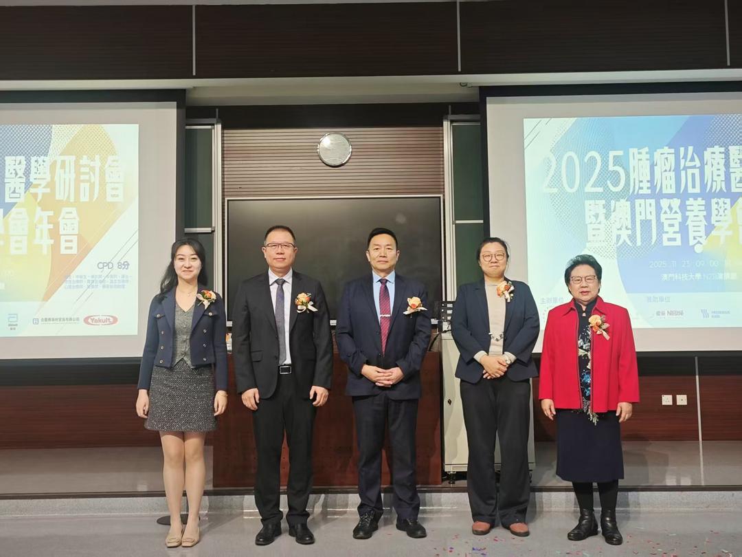本月23日由澳門營養學會主辦,澳門科技大學藥學院協辦,2025年腫瘤治療醫學研討會於澳門科技大學成功舉辦,聚焦腫瘤營養診療的前沿理念與實踐,旨在推動腫瘤營養體系向規範化、個體化、國際化邁進。澳門營養學會尤淑瑞理事長在開幕致辭中強調,腫瘤治療已進入“精准醫學、全週期管理”的新階段,營養支援作為診療全程的基石,其科學價值與臨床意義日益突顯。會議由澳門特區政府衛生局代表彭向紅醫生、鏡湖醫院李鵬斌院長、澳門協和醫院代表付錦顧問醫生、澳門科技大學藥學院代表丁倩教授及澳門營養學會尤淑瑞理事長主持開幕儀式。